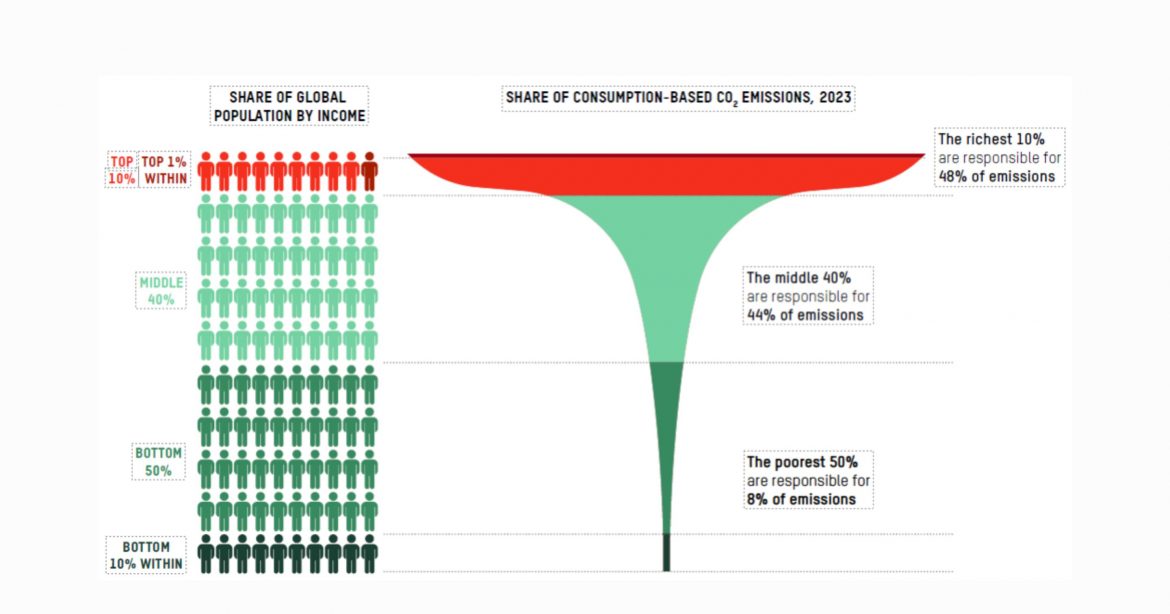Globale Einkommensgruppen und ihre jeweiligen konsumbezogenen Emissionen im Jahr 2023: Die ärmsten 50 % verursachten im Jahr 2023 8 % der globalen, konsumbezogenen Emissionen, während die reichsten 10 % für 48 % der Emissionen verantwortlich waren. Quelle: Oxfam
