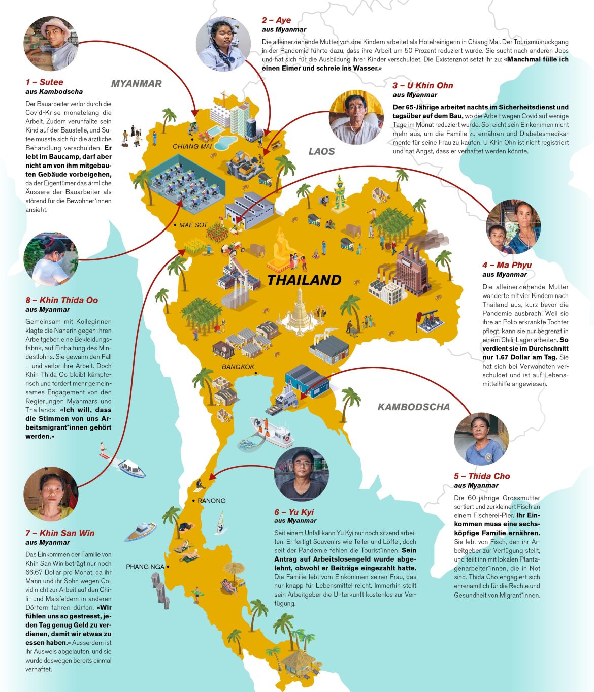 Eine extreme Form der Ungleichheit zeigt sich an den zwei Gesichtern Thailands. Während die einen ins Ferienland reisen, um sich von der Arbeit zu erholen, wandern Millionen Menschen aus Nachbarländern wie Myanmar nach Thailand aus, um Arbeit und ein besseres Leben zu finden. Doch für viele dieser Arbeitsmigrant*innen endet die Reise in Ausbeutung und Not. Lesen Sie hier acht von rund vier Millionen Geschichten.