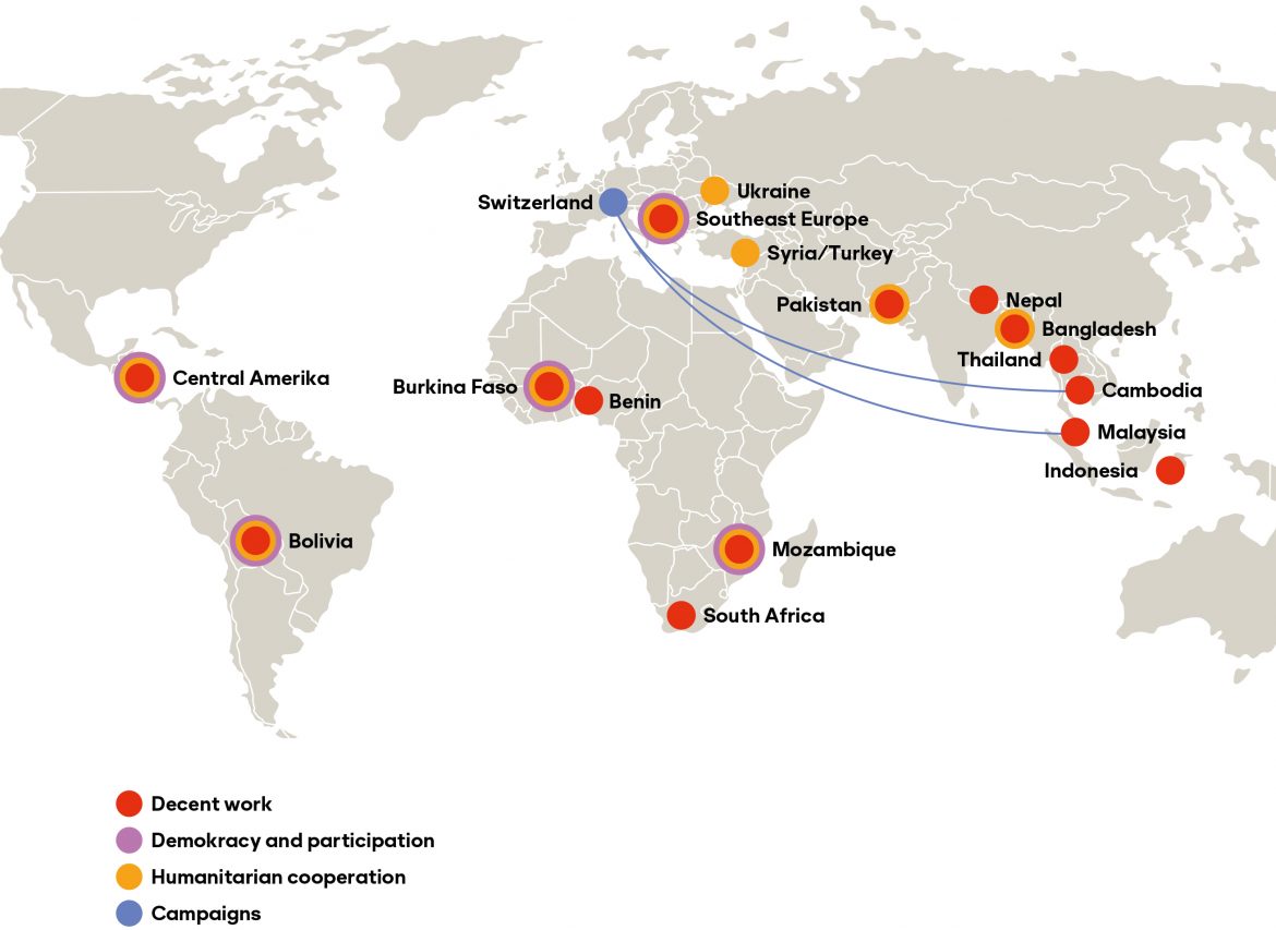 Our global commitment was particularly focused on those affected by conflict, natural disasters, and extreme inequality. In development cooperation, we invested in decent work, vocational training, and the strengthening of democratic participation in order to give local people the opportunity to improve their living conditions. In the area of humanitarian action, we focussed on overcoming acute crises and supporting people in need. In Switzerland, we raised awareness on the link between consumption, working conditions, and inequality.